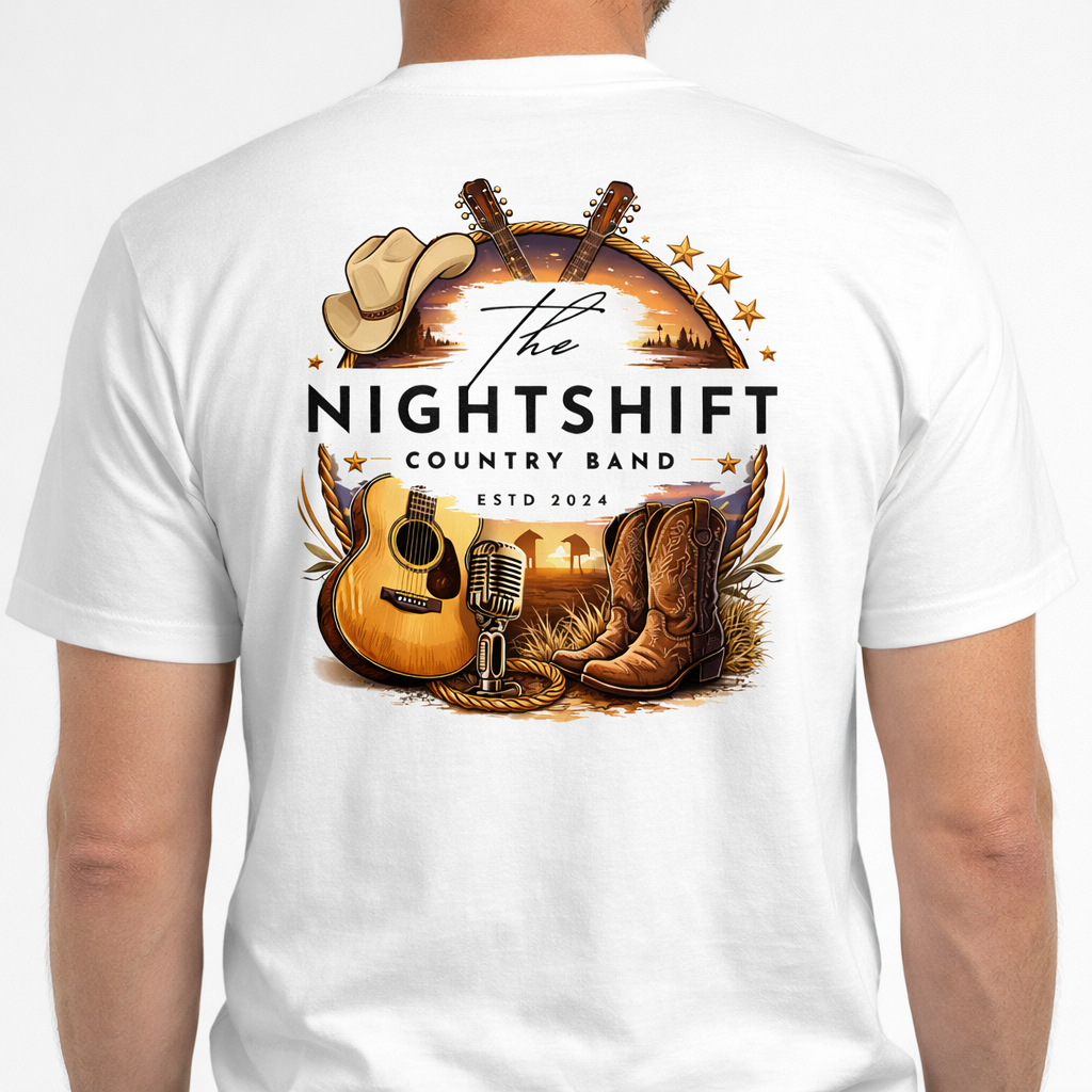 Show your love for authentic country music with this official The Nightshift band T-shirt. Designed for fans who live for small-town nights, live music, and honest country sound, this tee blends classic western elements with a bold, modern layout.